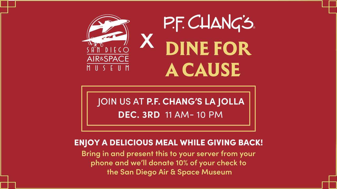 After a long day at the office or on your feet holiday shopping, treat yourself to a delicious meal, and P.F. Chang’s will generously donate 10% of your order to the Museum. Bring your friends and family - every bite makes a difference. Simply present the flyer to your server, whether you’re dining in or picking up takeout, and you help support the exhibits, events and programs that bring aviation to life.
