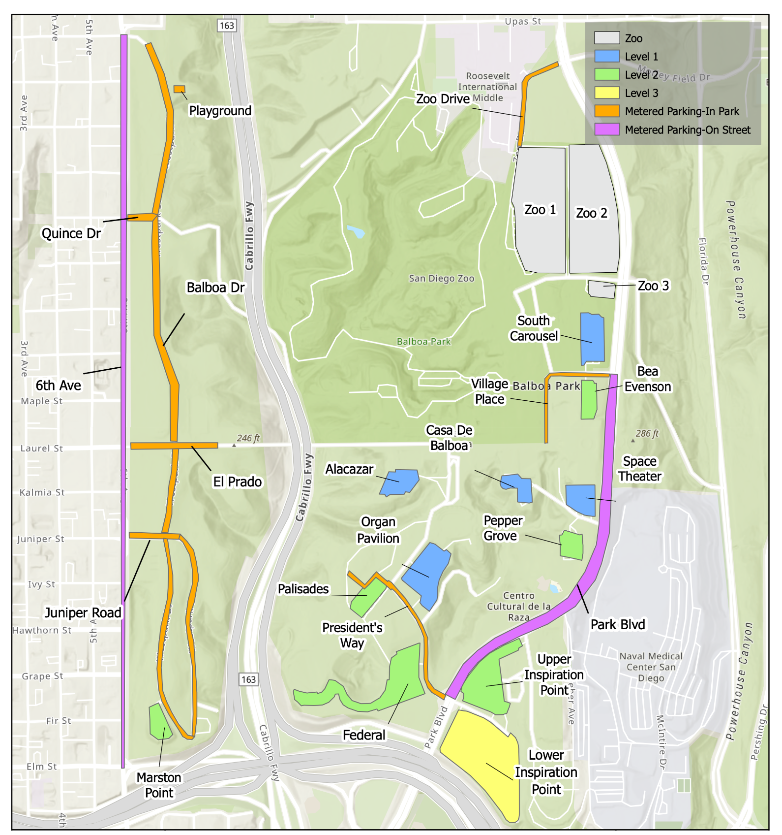 Balboa Park parking lots use a tiered system (levels) based on proximity to the park’s center. Paid parking in lots is enforced 8 a.m.–8 p.m.